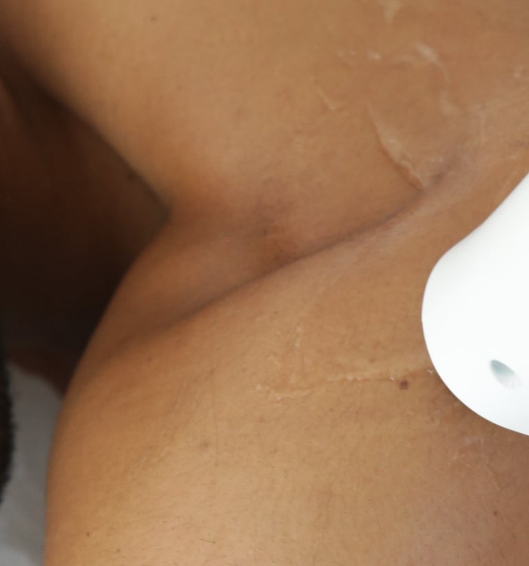 Despigmenta zonas corporales manchadas por la fricción, la rasurada, manchas post inflamatorias por secuelas de acné o quemaduras.